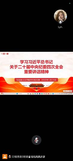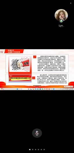 为深刻领会习近平总书记在二十届中央纪委四次全会上讲话的重大意义、精神实质和丰富内涵,准确把握全会提出的新论断、新部署、新要求,以全面从严治党新成效为推进员工支部高质量发展蓄势赋能,2025年1月14日,伟德国际victor1946员工党支部采用线上集中学习的方式组织全体党员及预备党员开展题为“学习习近平总书记关于二十届中央纪委四次全会的重要讲话精神”的主题党课活动,本次党课由员工党支部书记刘艳霓主讲。