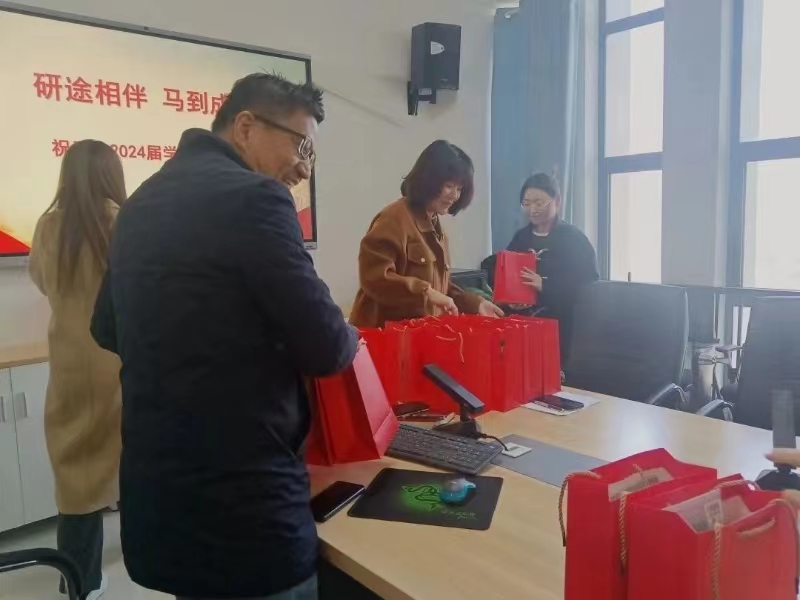 会议伊始,公司党委书记阮东彪向考研学子表达了深切慰问。他亲切询问各位考研学子的备考计划、是否与目标院校的学长学姐取得联系以及作息情况情况等。接着,副经理王竹苗针对临考常见问题与学子们交流经验。他肯定了大家持之以恒的努力,帮助大家树立信心,并指出,要“从战略上藐视敌人”,同时也要“从战术上重视敌人”。他强调,在最后的阶段,应该查漏补缺,计时且规范地进行模拟答题,争取在考场上达到最佳效果。紧接着,胡慧娥副经理再次提醒考研学子“保重身体、放平心态也是笑傲考场的关键”,只有以最好的状态迎接战场,才能顺遂无虞,皆得所愿。随后,公司党委副书记胡英为大家送上美好祝福,愿大家保持好心情,保重好身体,保证好状态,在考场上文思如泉涌,下笔有神助,考出人生好成绩。最后,老师们亲手将象征着关怀与重望的祝福礼包送给在座的每一个同学。