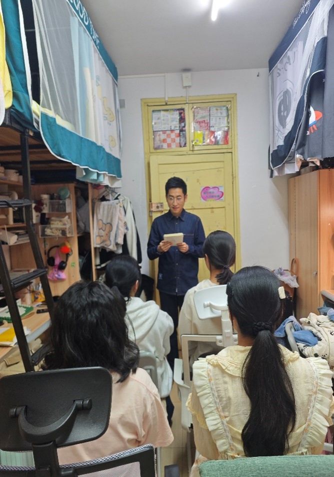 于澎老师全程参与活动并给予指导。他在现场总结讲话:"心理健康是员工全面发展的基石。这种深入宿舍的宣讲形式实现了'润物细无声'的教育效果,让同学们在生活场景中掌握自我调节技能。"结合多年工作经验,他鼓励同学们主动关注心理健康,善用公司资源:"无论天气阴晴,希望每位同学都能保持内心阳光,遇到困难及时寻求专业帮助,共同营造温暖向上的成长环境。"