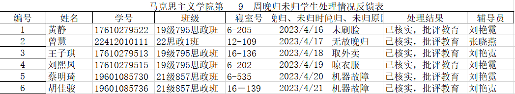 总结:本周宿舍卫生大检情况较上周差,差寝数量增加,如795思政班6-201(黄毅敏、唐子婕、李嘉慧、李效阳)与203(丑心仪、童昕阳、谭子涵、易正萍)、20思政1班6-333黎晓衫、宁慧娟、钟丹、刘凌)、825思政班与857思政班6-539(粟向裕、唐小蕾、李菁、吴牧宁)、896思政班6-640(蒋京素、姚瑶、胡君忆、龙嘉和)等宿舍需要继续改进!希望各班加强宿舍卫生管理!