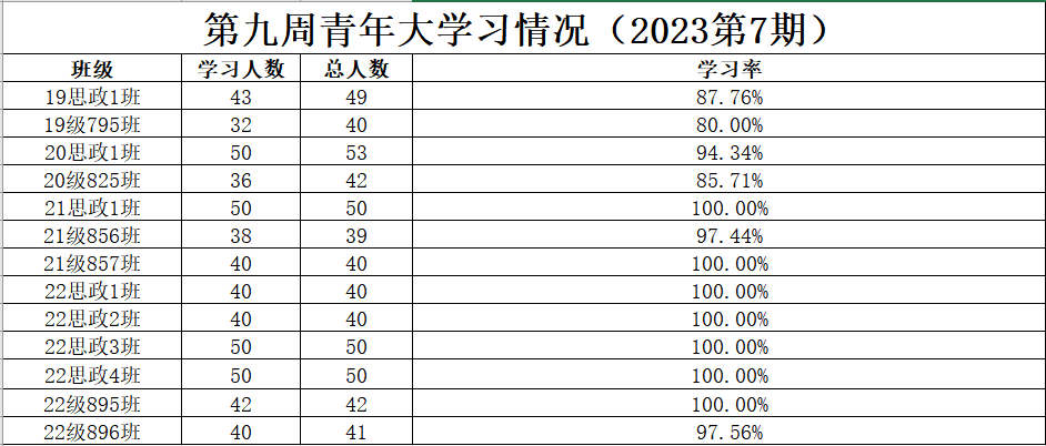 总结: 在本次青年大学习,21思政1班、21级857班、22思政1班、22思政2班、22思政3班、22思政4班、22级895班学习率达到了100%,在这里提出表扬;