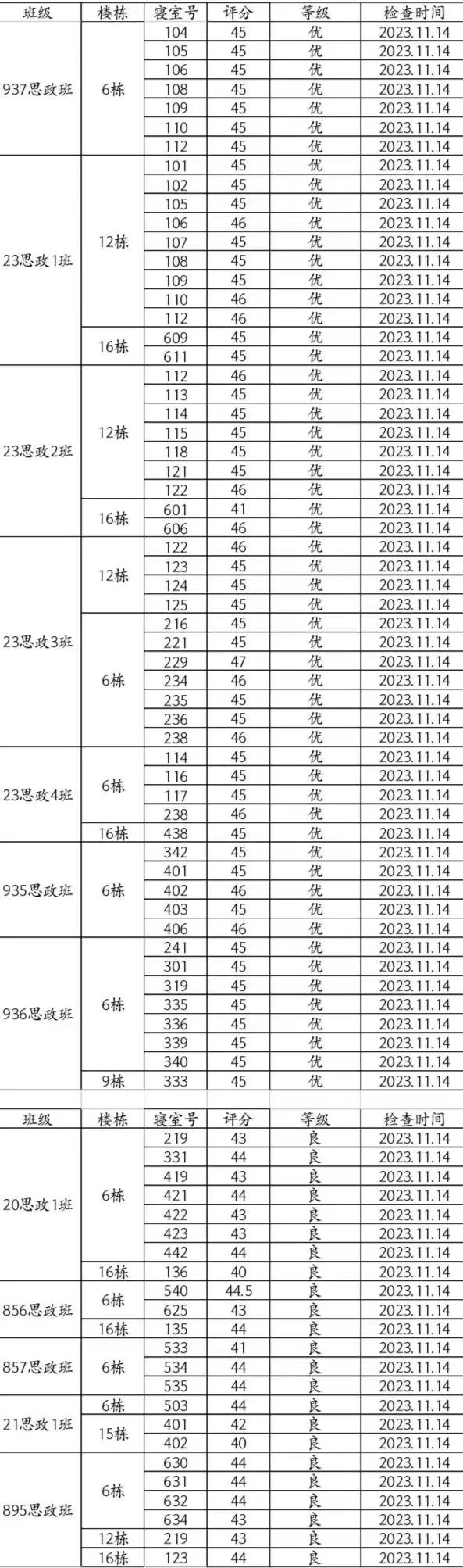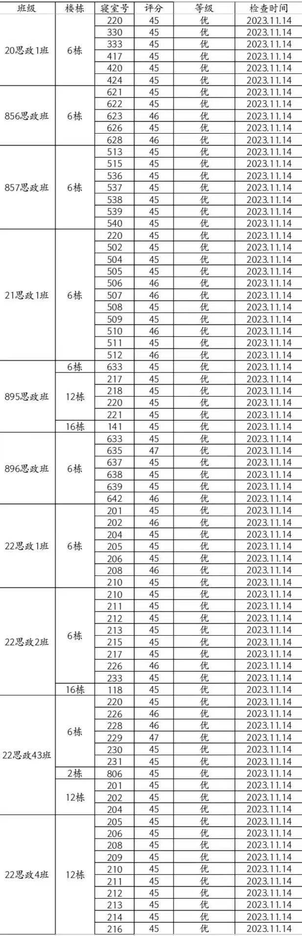 总结:本周卫生检查情况总体表现中等,其中856思政班6-627(刘书筠、邓利菲、李欣悦、郭斯颖)与6-629(谢美琳、何雪玉、兰星宇、余敏)、857思政班16-137(丁嘉豪、周靖浩、符灿宇、田畅轩)、22思政3班16-110(王鸿宇、高睦涵、向成林、赵嘉豪)、23思政3班6-237(林涵萱、王凤麟、赖语婷、王耀)、23思政3班与23思政4班混寝16-439(唐慕逍、张耿荣、周顺翔、周家利)等宿舍卫生情况较差,仍需继续改进。希望大家共同努力,建立文明美丽清洁宿舍!