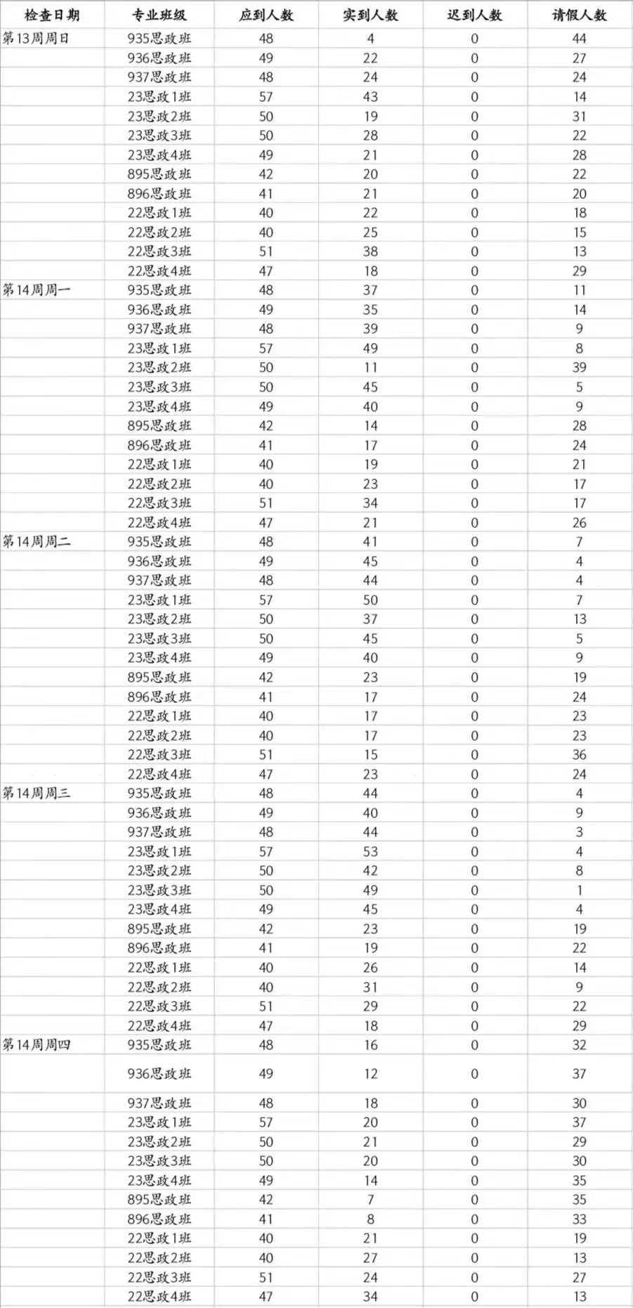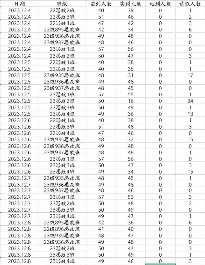 本周早自习整体表现情况不错,但部分同学未遵守早自习纪律,无故缺席∶ 22思政2班∶9梁燕妮、37赵青山、39钟震宇、40何宏宇;22思政3班∶44葛翔宇、47王鸿宇、50向成林;22思政4班∶45赵嘉豪、48 刘耘彤;23思政4班∶44号胡英豪。