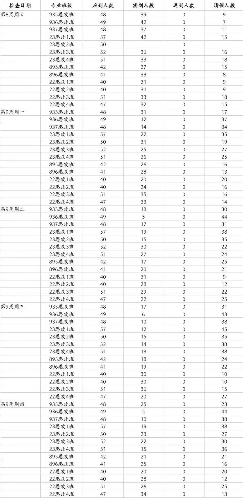 马院第九周查堂情况