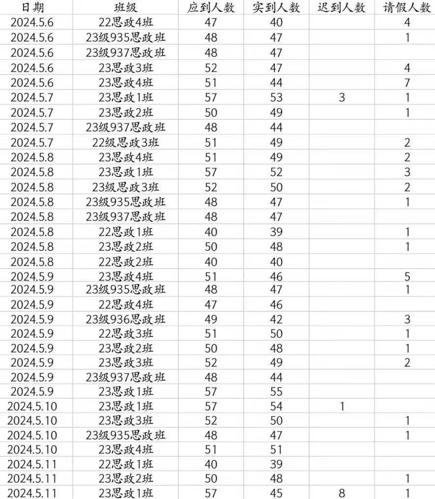 本周大部分班级表现良好,但有班级出现缺席现象,如22思政4班7号刘婉婷和48号刘耕彤两位同学,希望表现好的班级继续保持。