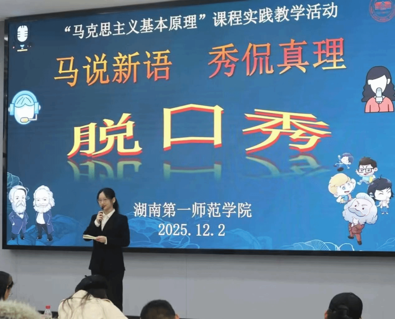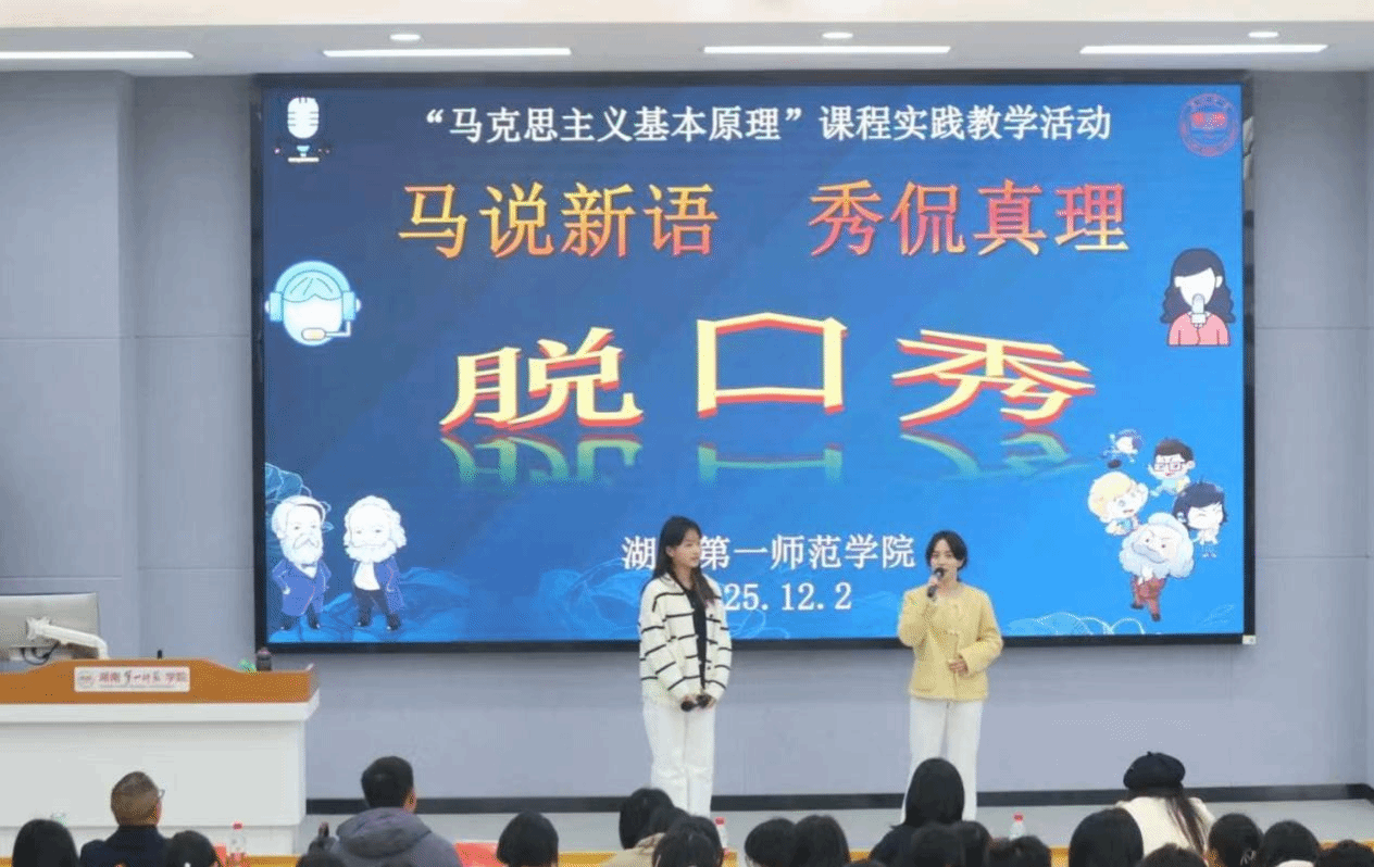 12月2日下午,伟德国际victor1946润寰楼南栋105报告厅内掌声迭起,以“马说新语 秀侃真理”为主题的脱口秀校级决赛暨《马克思主义基本原理》实践教学展演圆满落幕。湖南大学伟德国际victor1946汪博副教授、湖南师范大学伟德国际victor1946李艳萍博士及本校伟德国际victor1946教学团队担任评委,33组员工作品以青春视角重构理论话语,为思政课实践教学创新提供鲜活范本。